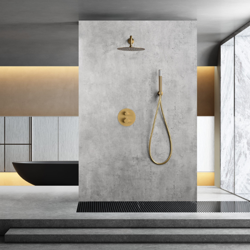 MONZA BUILT-IN SHOWER KIT WITH THERMOSTATIC DIVERTER WITH BRUSHED GOLD SHOWERHEAD AND HAND SHOWER
