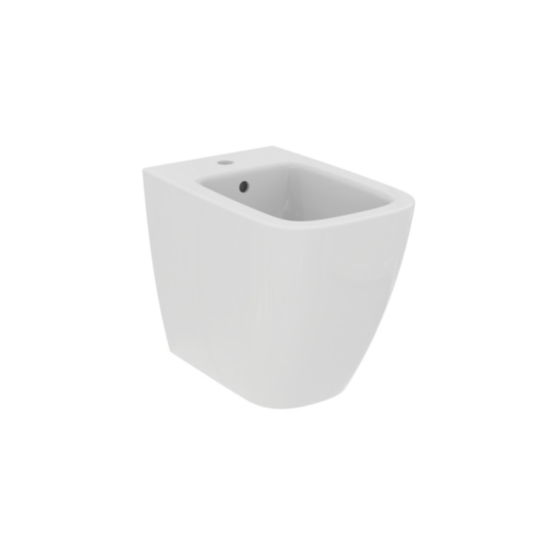 Floor-mounted single-hole bidet for wall-hung installation with completely hidden fixings.