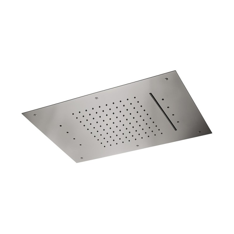 Recessed rectangular SOFFIONE in steel with rain jet, waterfall, and automatic multicolor lighting system.