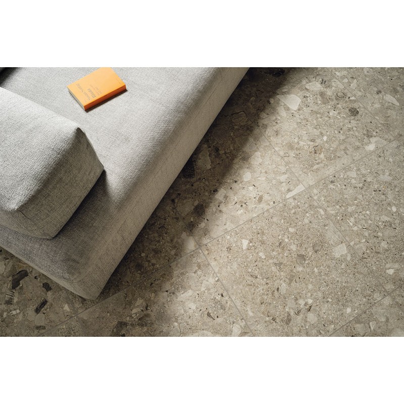 The stone-effect porcelain stoneware of FRAMMENTA features a strong irregularity of grains, or pebbles, with areas of mini stone and macro stone that make it visually impactful and the absolute protagonist of residential or commercial spaces, both indoor and outdoor.