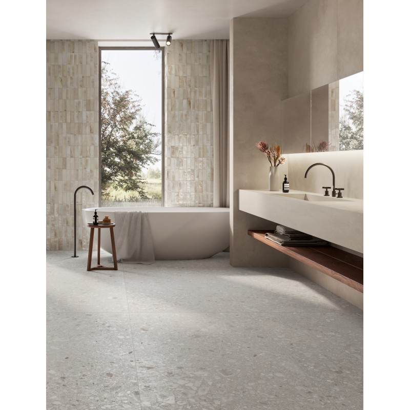 The porcelain stoneware collection faithfully reproduces the aesthetics of Ceppo di Gré, characterized by the presence of small and large "pebbles" that enrich the neutral base of the stone. Four colors, in two cool and warm shades, are available in the new GRANDE size 90x180 cm and in sizes 120x120, 60x120, and 60x60 cm. The collection is completed by the Preincised Listello in the size 14x120 cm, a decorative element characterized by a surface incision that allows for the creation of contemporary wainscoting, and the more traditional Triangle Mosaic in the size 29x39 cm.