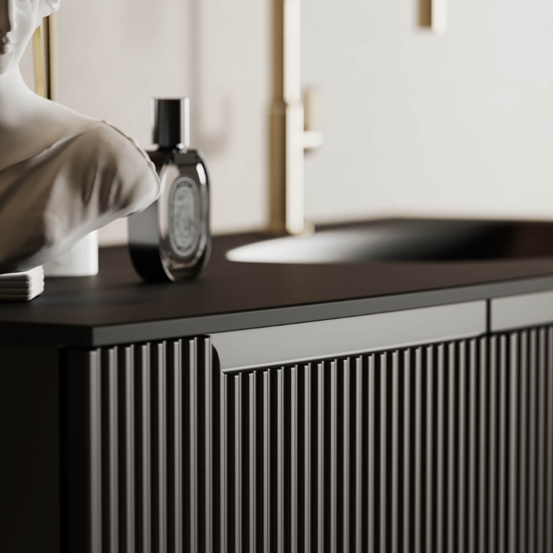 In this proposal, the DIX mirror with integrated lighting becomes the ideal extension of the colors of the top and cabinet, for a monochromatic overall effect.
