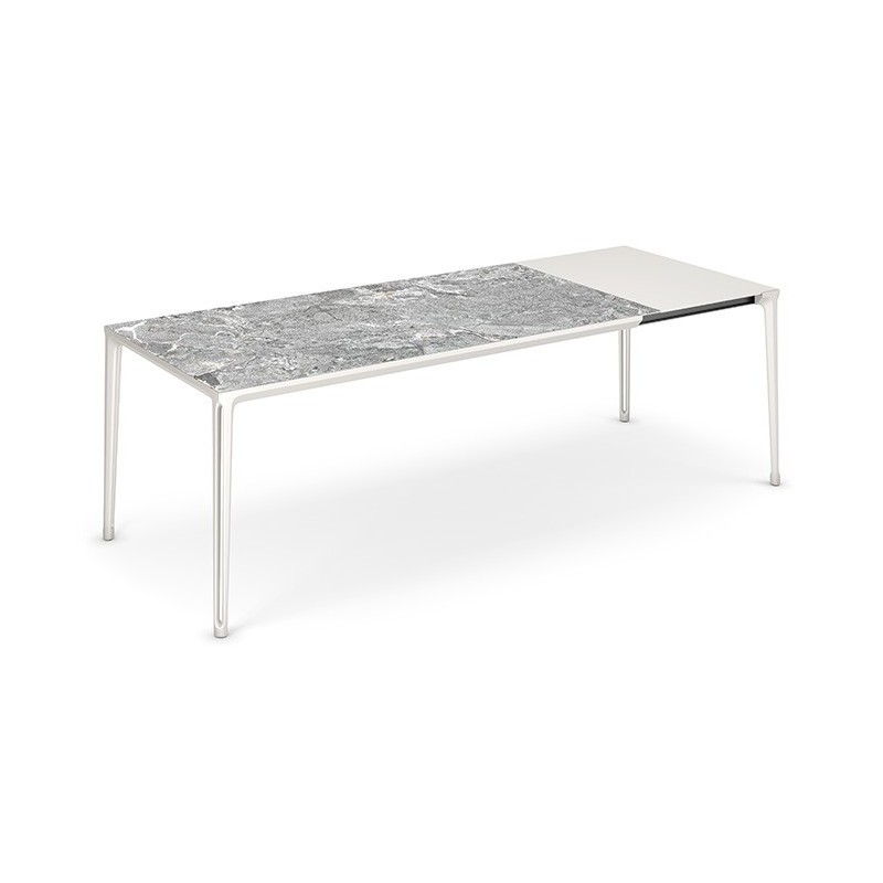 Legs and structure in epoxy powder-coated aluminum. Sliding rails in epoxy powder-coated aluminum and steel. Top in laminated porcelain with a thickness of 6 mm. The porcelain in Portoro matte and Portoro glossy finishes is 5 mm thick. Extension in embossed painted MDF. Finishes as per sample book.