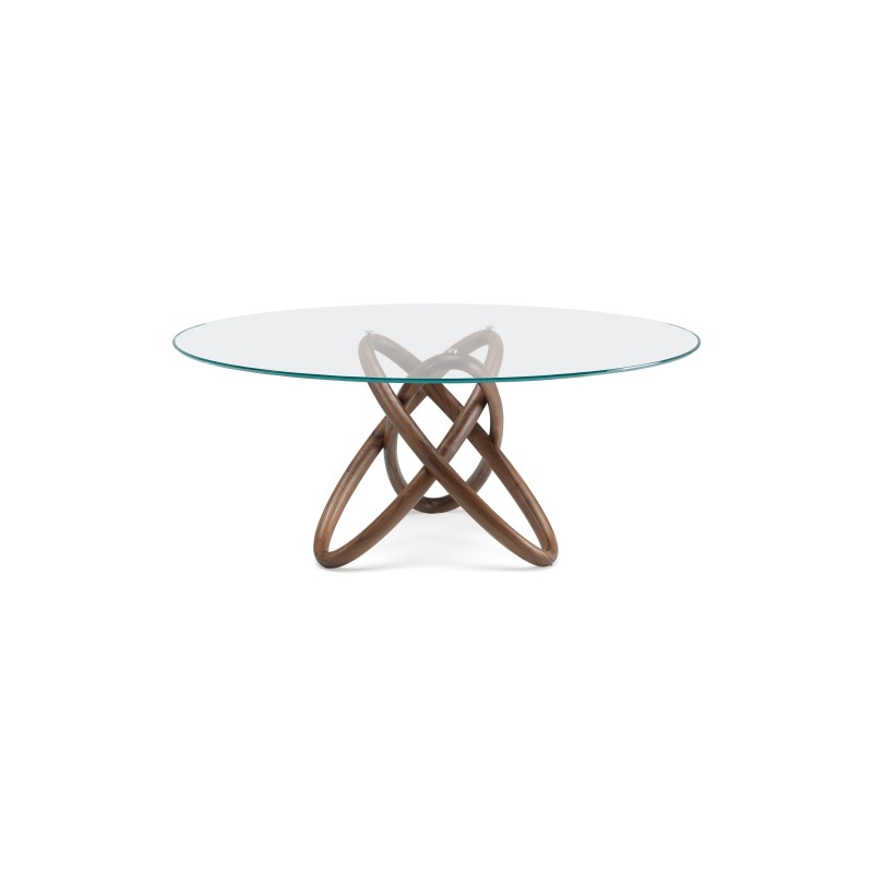 The Carioca glass table is a sophisticated and original piece of furniture. It is a modern table with a sculptural base, featuring three wooden rings, and a fine PIANO in crystal, which will add a refined touch to your home. Carioca can be a rectangular glass table, also with a shaped form, or it is made as a modern round table in different sizes. This table is enhanced not only by the spectacular design of the solid wood base but especially by the quality of the craftsmanship and materials and the attention to detail that distinguishes Italian manufacturing.