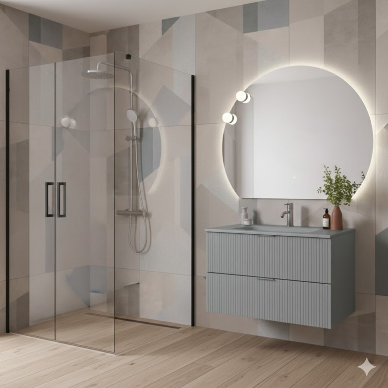 LINE COMPOSIZIONE MOBILE 100 CM CON LAVABO IN VETRO SATINATO GRIGIO OPACO C/SPECCHIO TONDO